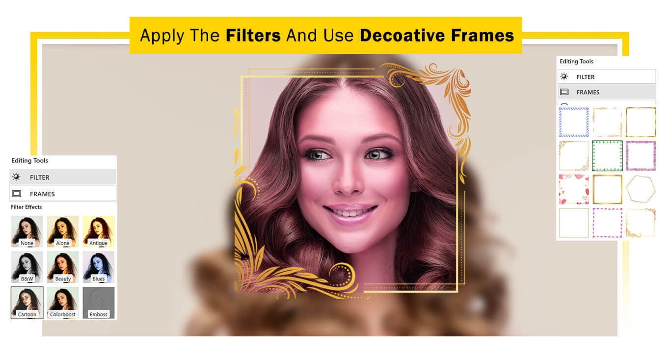 - Click on the “Frames” button to explore a variety of border frames.